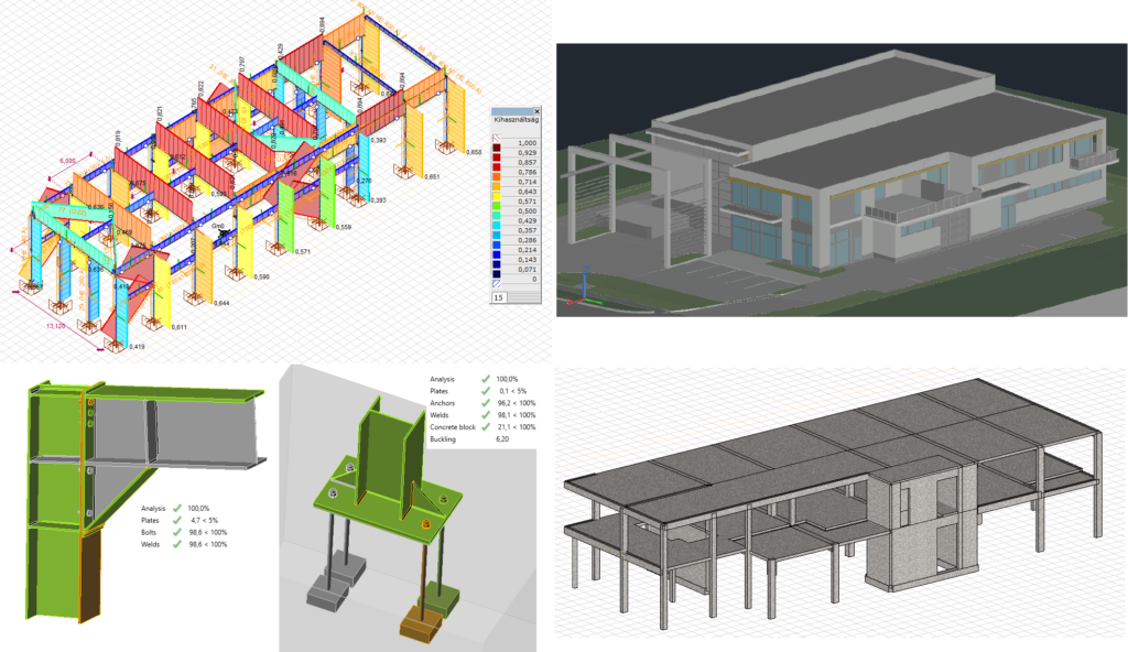 Egy nagy belmagasságú, raktározási célú, acélszerkezetű, daruzott csarnoképületből és egy kétszintes, hagyományos monolit vasbeton vázszerkezetű, lapostetős fejépületből álló ipari épület engedélyezési terve.